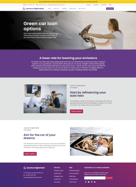 Personal Going Green Prospect (B2C)Display Green Car loan-Promo.Visitors who visit the site with the following utm parameter added to their URL: utm_campaign=summer_car_LoansThe Personal page banner is personalized with messaging specific to Green Car Loans, guiding prospects toward the loan application process.
